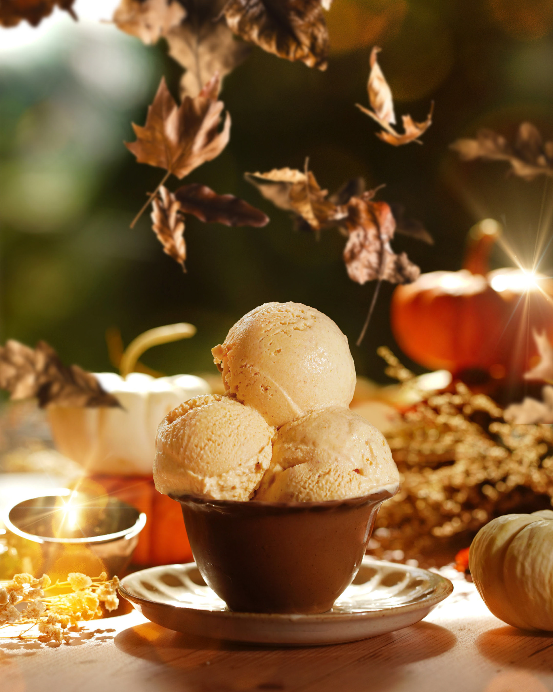 Pumpkin Ice Cream with falling leaves for seasonal product photography.